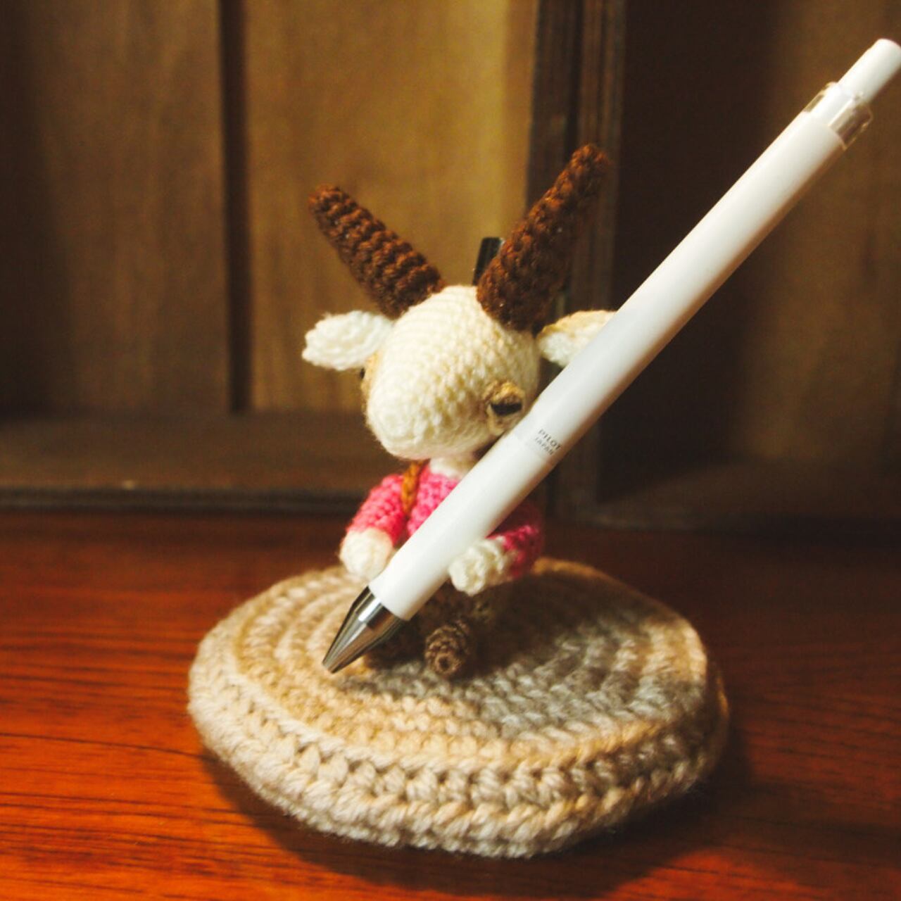 土台にはコルク製のコースターを使用し、毛糸で包んで仕上げているため、あみぐるみが安定して座れるようになっています。
